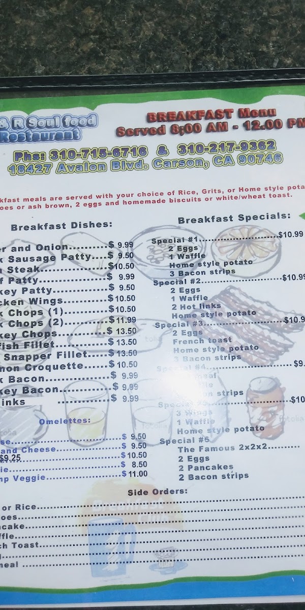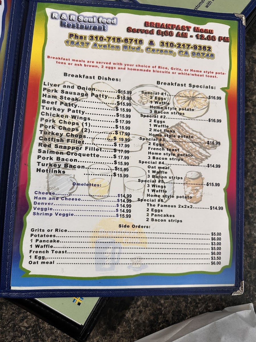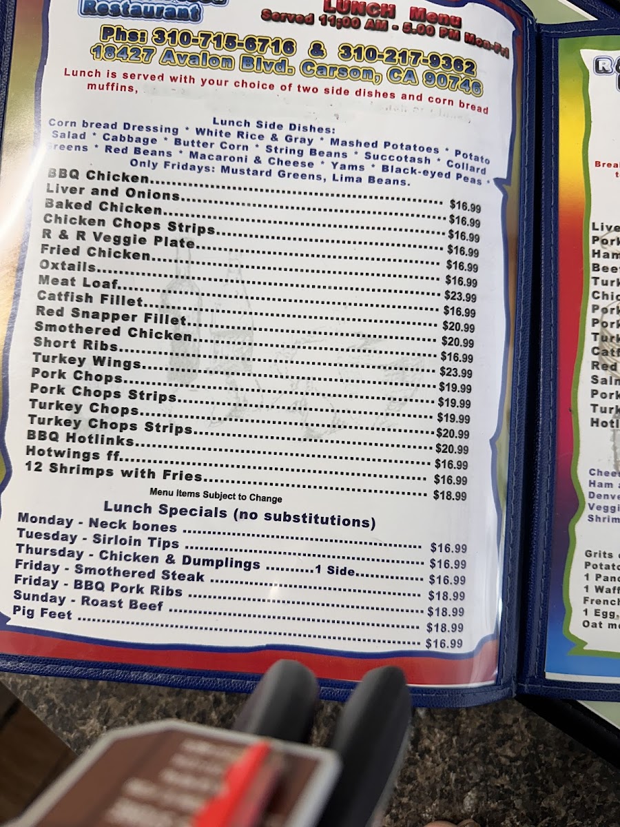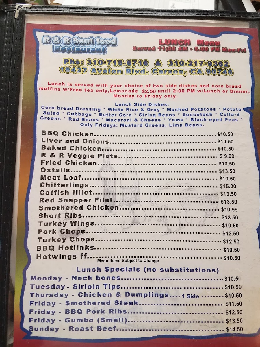 R & R Soulfood Menu brings that comforting, home-style vibe the moment you start looking through the dishes, and it fits perfectly with the relaxed feel of its spot over on 18427 Avalon Blvd in Carson. Everything here leans into rich, familiar flavors, and as you read through the options, you can almost tell how much care goes into each plate. Fried chicken comes out golden and crisp, while the smothered pork chops feel like something you’d want on a slow Sunday afternoon. And because no soul food spread feels complete without the sides, you’ll find all the classics-mac and cheese, collard greens, candied yams-each one hearty enough to steal the spotlight for a moment. Even the cornbread adds its own little warmth, tying the whole meal together in that satisfying, down-to-earth way that keeps people coming back.