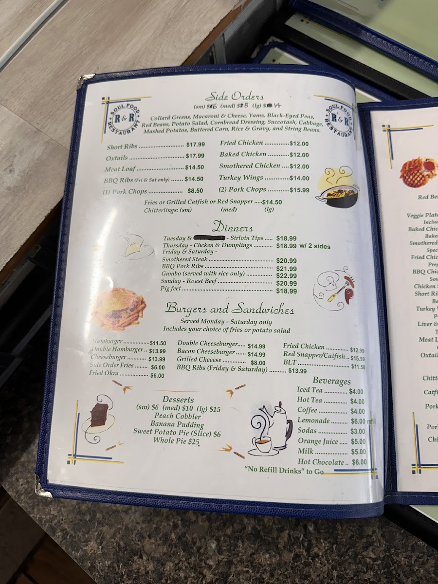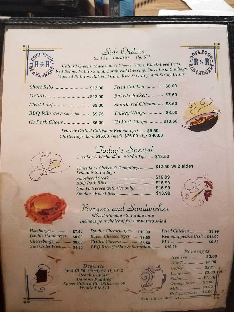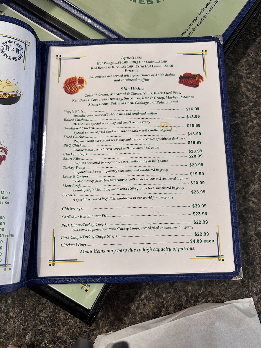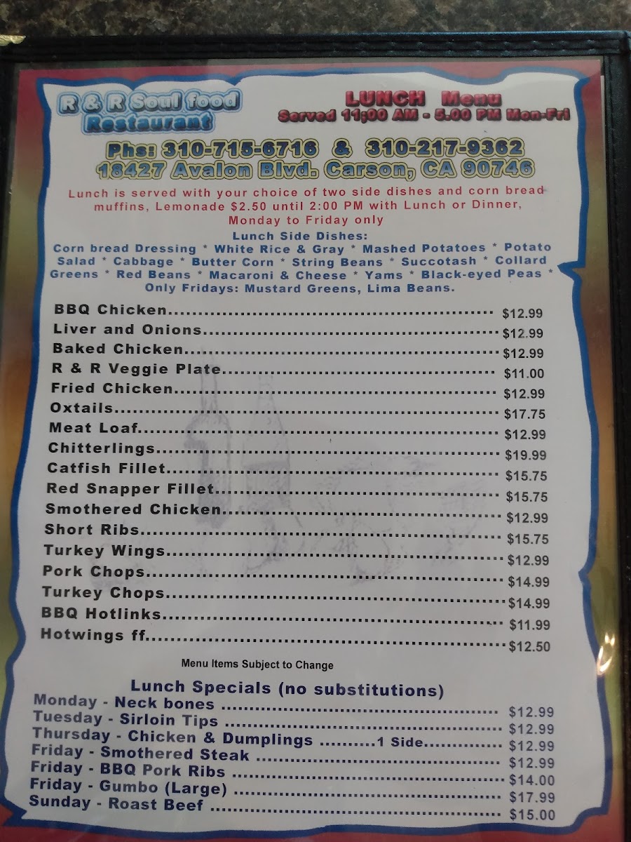 R & R Soulfood Menu brings that comforting, home-style vibe the moment you start looking through the dishes, and it fits perfectly with the relaxed feel of its spot over on 18427 Avalon Blvd in Carson. Everything here leans into rich, familiar flavors, and as you read through the options, you can almost tell how much care goes into each plate. Fried chicken comes out golden and crisp, while the smothered pork chops feel like something you’d want on a slow Sunday afternoon. And because no soul food spread feels complete without the sides, you’ll find all the classics-mac and cheese, collard greens, candied yams-each one hearty enough to steal the spotlight for a moment. Even the cornbread adds its own little warmth, tying the whole meal together in that satisfying, down-to-earth way that keeps people coming back.